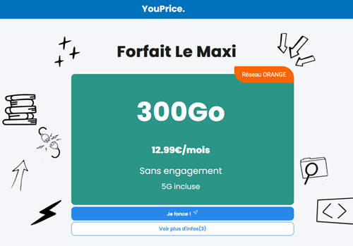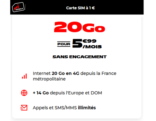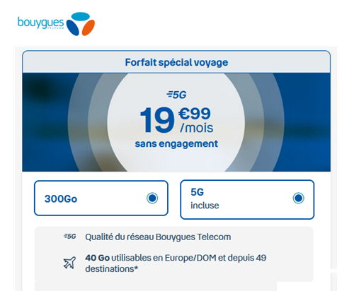 Itinérance Pays inclus Itinérance Pays inclus Itinérance Pays inclusAucun🇩🇿 Algérie (5)🇦🇩 Andorre (14)🇨🇲 Cameroun (3)🇨🇮 Côte d'Ivoire (3)🇲🇱 Mali (3)🇲🇦 Maroc (4)🇲🇨 Monaco (46)🇸🇳 Sénégal (5)🇨🇭 Suisse (10)🇹🇳 Tunisie (5)🇹🇷 Turquie (5) Données (Go) Données (Go) réinitialiser Prix (€/mois) Prix (€/mois) réinitialiser Nos préférés Nos préférés 🔥 Bon choix (22) 5G 5G oui (44)option (8) 🌍 B&You, forfait 5G Voyage 300Go à 20€/mois🌍 B&You, forfait Voyage 80Go à 8€/mois (1 an)🔖 NRJ Mobile, forfait illimité/20Go à 6€/mois🌍 Sosh, forfait 5G Voyage 200Go à 16€/mois🔖 CDiscount Mobile, forfait illimité/10Go à 5€/mois🔖 Red by SFR, forfait illimité/10Go à 6€/mois🔥 Youprice (SFR), forfait 5G illimité/300Go à 10€/mois🔥 Youprice (Orange), forfait 5G illimité/300Go à 13€/mois 123…89Suiv